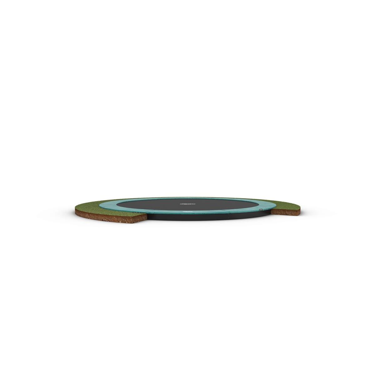 Het stevige frame van deze trampoline wordt volledig ingegraven. Het enige wat je ziet zijn de beschermrand en het springdoek. De trampoline is eenvoudig te betreden.