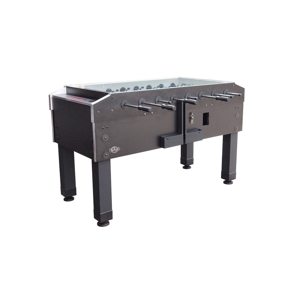Het gezandstraalde speelveld zorgt voor extra grip en door de opstaande randen en hoeken rolt de bal altijd terug in het veld. De solide stangen zijn voorzien van schroevendraaier grepen. De teams van deze Buffalo tafelvoetbaltafel bestaan uit verzwaarde poppen. De kast van de Buffalo voetbaltafel is gemaakt van dik multiplex en afgewerkt met aluminium bescherm strips. Het geharde veiligheidsglas beschermd tegen vocht, vuil en vandalisme. De tafel is afsluitbaar met dubbele vergrendeling. De Buffalo Tournament voetbaltafel is voorzien van geïntegreerde handmatige scoretellers en bekerhouders.