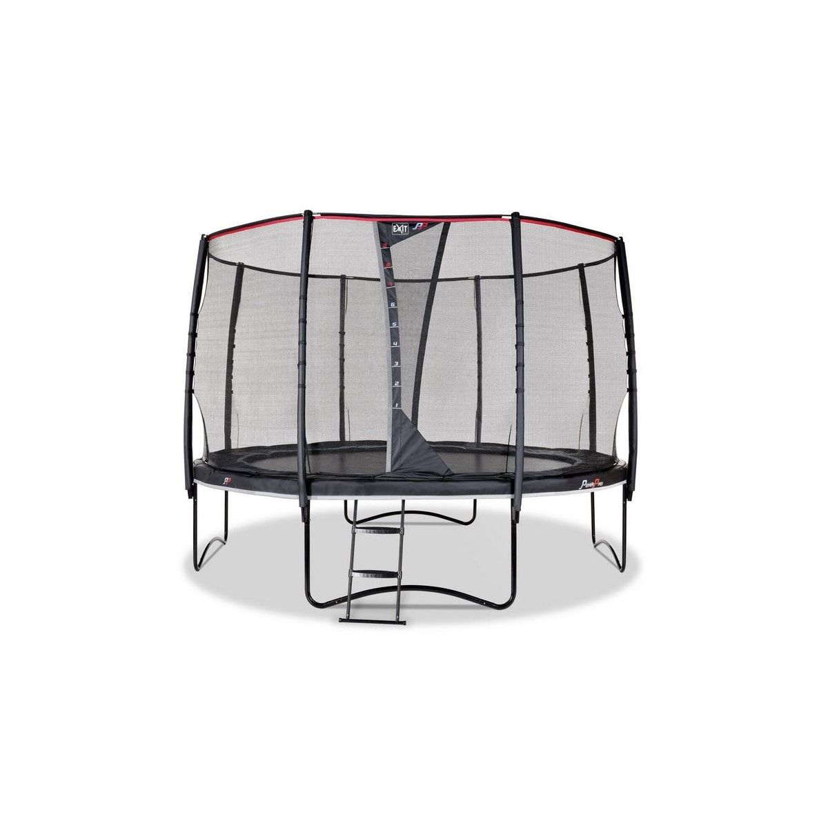 De EXIT PeakPro trampoline met veiligheidsnet is een ronde trampoline met een matzwarte beschermrand en eersteklas springcomfort. De grote trampoline heeft een robuuste uitstraling door het zwarte frame, de subtiele kleurdetails en reflecterende bies: een pronkstuk in iedere tuin. Bij deze trampoline wordt een trampolineladder meegeleverd zodat je veilig en snel op de trampoline klimt. Met de PeakPro trampoline in de tuin staan kinderen te springen om hun kunsten te laten zien.
