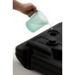 De zwarte polyethylene voet heeft een afmetingen van 77 x 55 x 13. Deze kan je vullen met water gemixt met antivries of met zand.