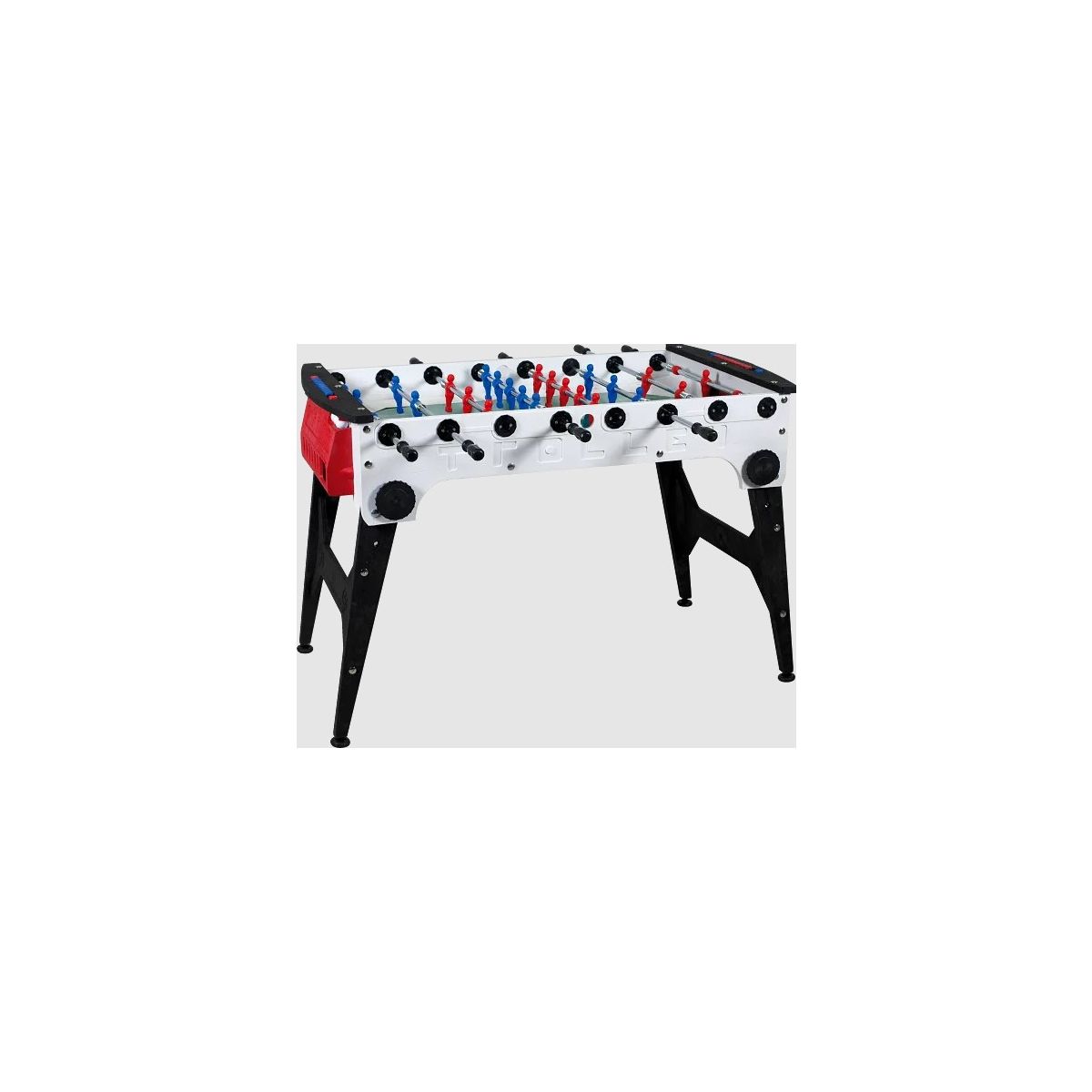 De North „Storm Outdoor Trolley“ tafelvoetbal is perfect voor gebruik in open zwembaden, op campings en binnen onderwijsinstellingen. Deze duurzame voetbaltafel, gefabriceerd uit 20 mm dik thermoplastisch kunsthars, weerstaat probleemloos de dagelijkse drukte die bij intensief gebruik hoort, maar ook diverse weersomstandigheden. Het solide frame rust op klassiek aflopende poten, wat zorgt voor optimale stabiliteit. De chromen speelstangen bieden niet alleen extra sterkte; dankzij de glijlagers zorgen ze tevens voor een soepele ervaring waardoor een spel zonder vermoeidheidsverschijnselen mogelijk is – zelfs bij de meest energieke potjes. De zwarte kunststof handvatten zorgen voor een uitstekende controle over het spel, terwijl de stootvaste voetbalspelers, bevestigd op de stangen en demping de afstand naar de tafelwand, zo goed als onverwoestbaar zijn. Het speelveld is verfijnd met een 5 mm dikke geharde glasplaat, gemarkeerd met witte lijnen voor een duidelijke spelopmaak. Plastic hoeken verzekeren dat de bal altijd in het spel blijft, terwijl ingebouwde doel/balcontainers aan de uiteinden de bal gemakkelijk toegankelijk maken vanaf beide zijden van de tafel. Compleet met een 360 graden draaibare keeper, is geen hoek te moeilijk om te verdedigen.