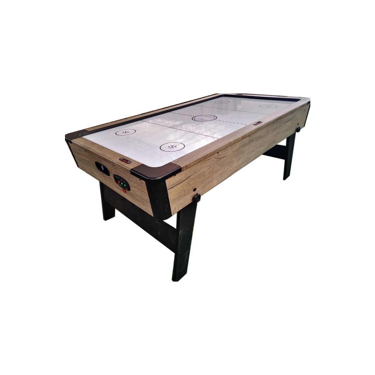De fraaie wood-look body en stevige constructie zorgen voor een stabiele en duurzame speelervaring. Het witte PVC-speelveld met zwarte formica stootzijdes biedt uitstekende glijeigenschappen en een strak, uitnodigend uiterlijk. De krachtige 220V UGLS-blower creëert een wervelende en gelijkmatige luchtstroom, zodat de puck razendsnel en soepel over het veld beweegt. Dankzij de royale speelmaat van 180 cm is er ondanks de compacte opbergmaat volop ruimte voor dynamische wedstrijden.