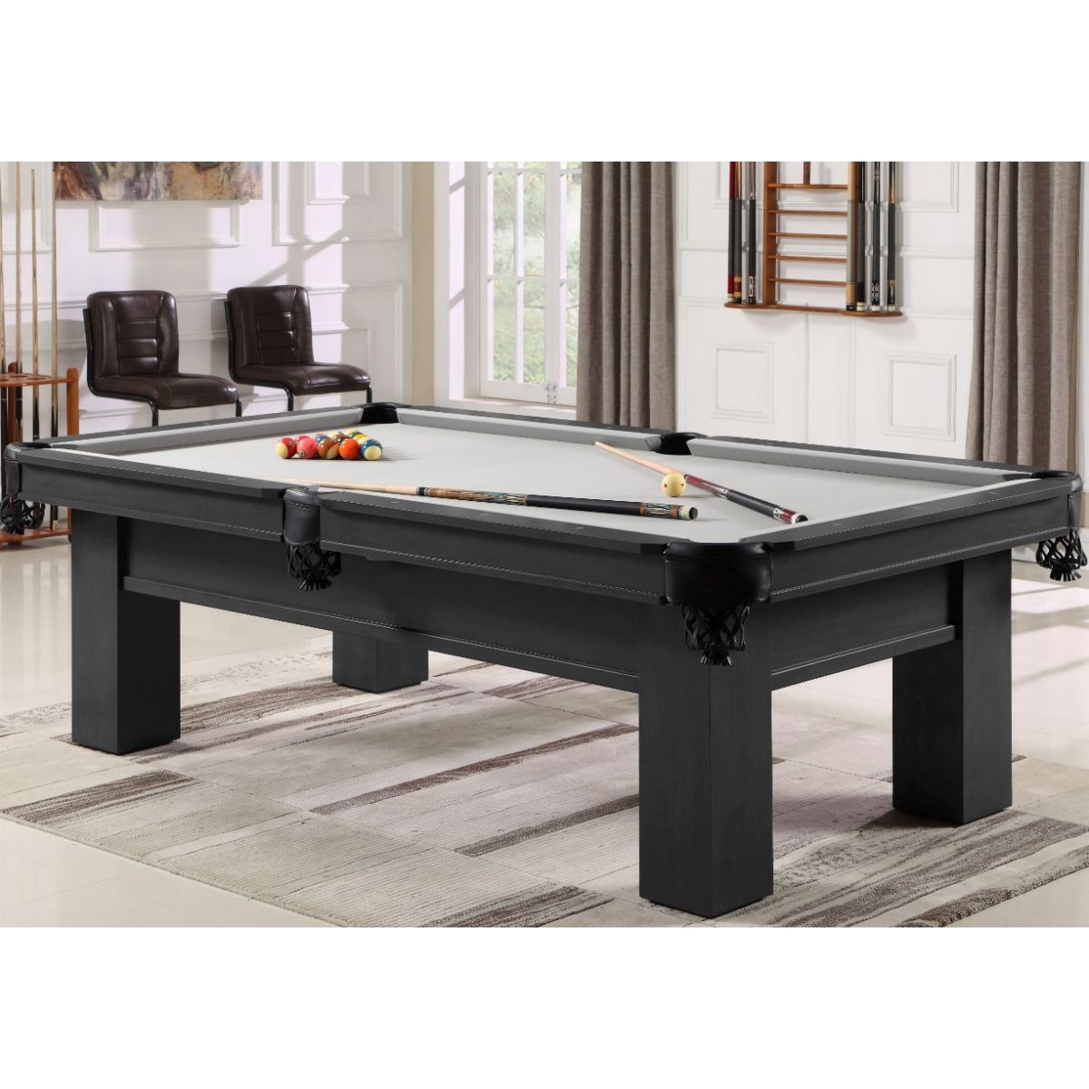 Uitgevoerd met 3-delige UFS A-klasse leisteen 25mm dik, banden en meubel zijn van massief hardhout, vollederen pockets met stalen kern, precisie stelpoten op chromen schotels, wedstrijd laken en kleur naar keuze.