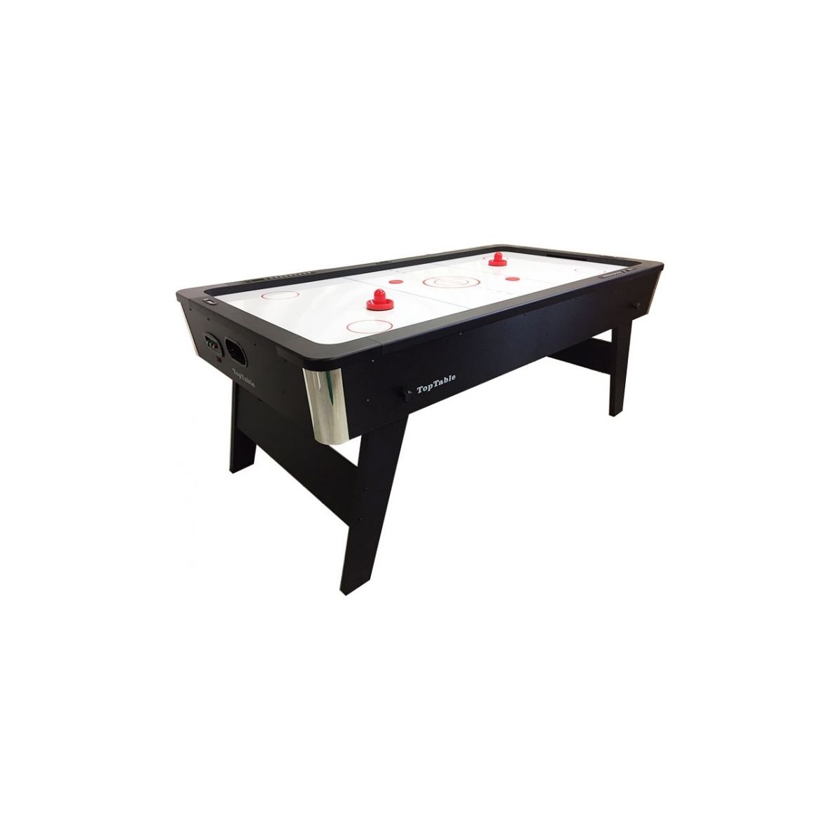 De krachtige 220V UGLS-blower creëert een wervelende luchtstroom zodat de puck soepel, snel en constant over het speelveld glijdt. Het luxe elektronische scoresysteem, geïntegreerd in de omranding, beschikt over drie displays, verschillende time-tracks en uitnodigende geluidseffecten. Daarnaast zijn er verzonken handmatige scoretellers aanwezig, ideaal wanneer je kiest voor spelen zonder elektronisch geluid of wanneer je een (optioneel) tafeltennisblad plaatst.
