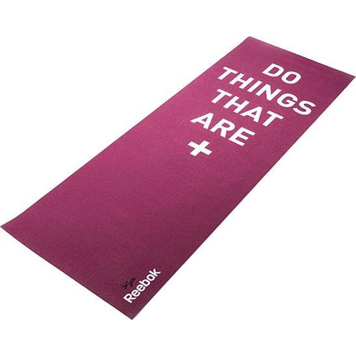 Dubbelzijdige paarse yoga mat uit de Reebok Yoga range met motiverend design “Do things that are +”. De 4 mm dikke mat zorgt voor een comfortabele uitvoering van de oefeningen en de non-slip structuur zorgt ervoor dat de mat niet verschuift. Na gebruik is de mat makkelijk schoon te maken. Afmeting 173 x 61 cm.